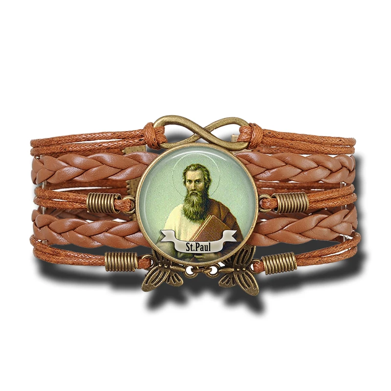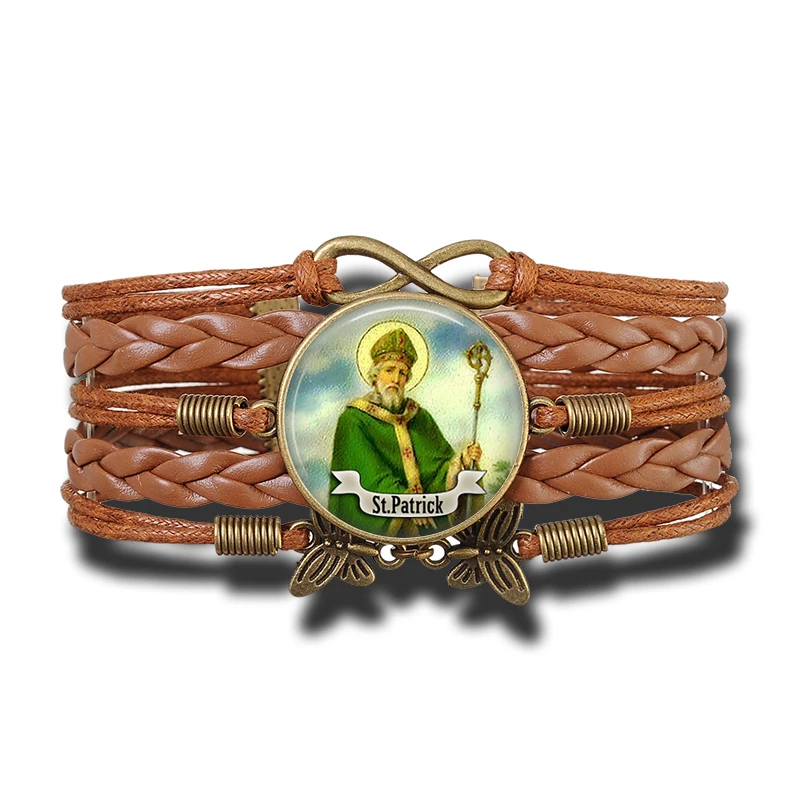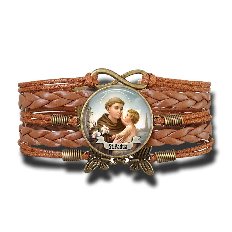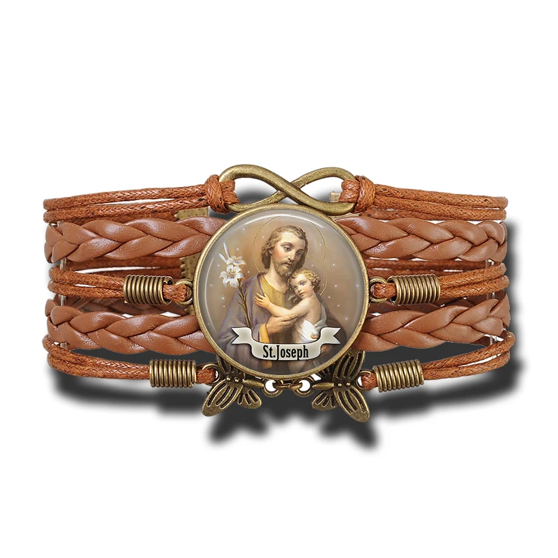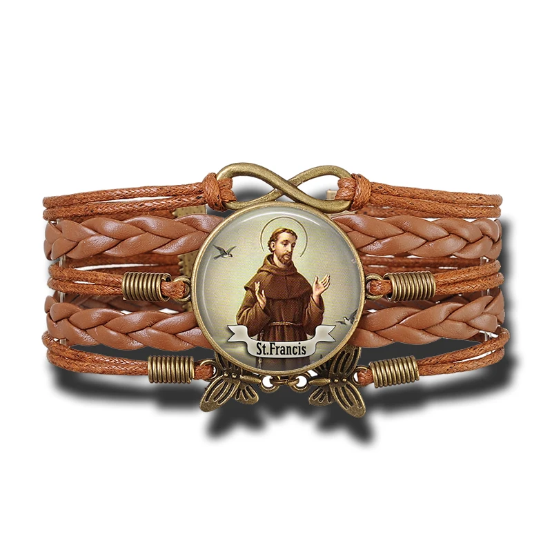 Brazaletes católicos cristianos estilo bohemio vintage artesanal con motivos religiosos, elaborado en cuero y aleaciones metálicas de cobre. Con escudos dedicados a varios santos religiosos, ideal para los feligreses de varios de las iglesias cristianas y católicas.