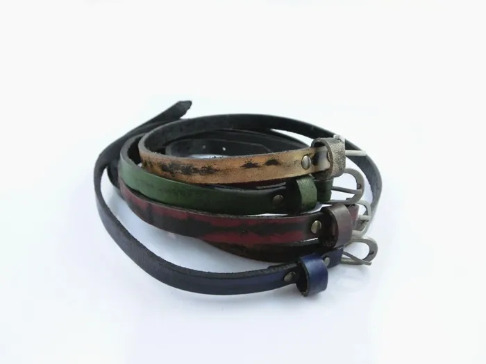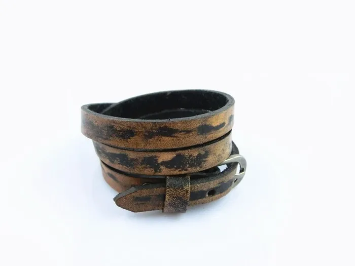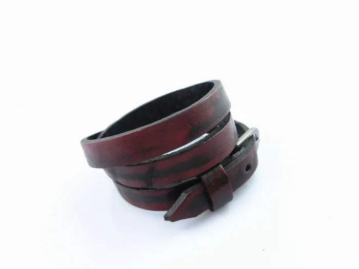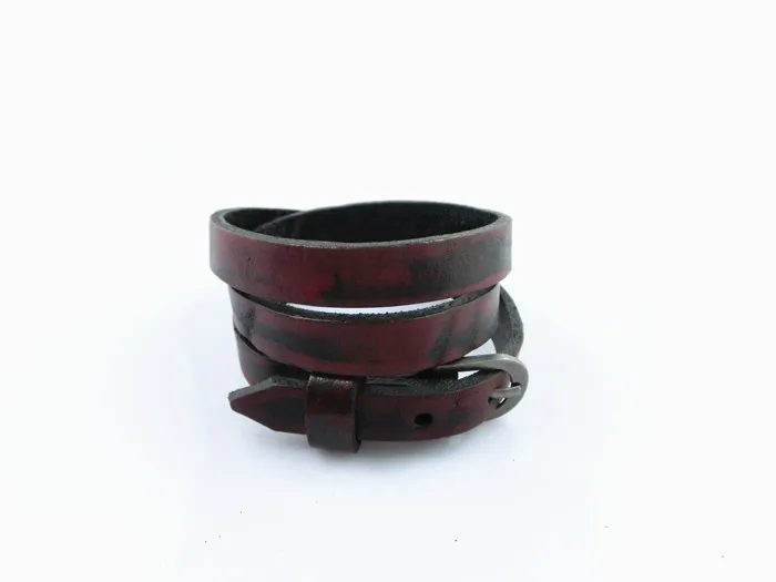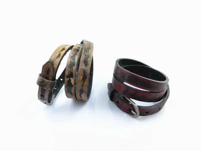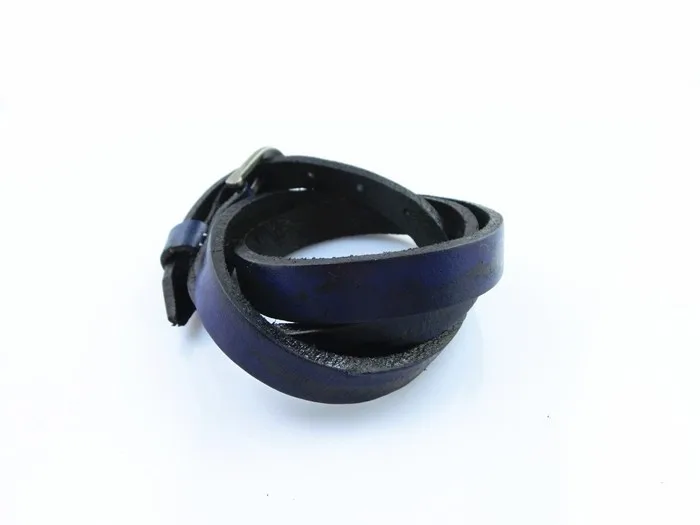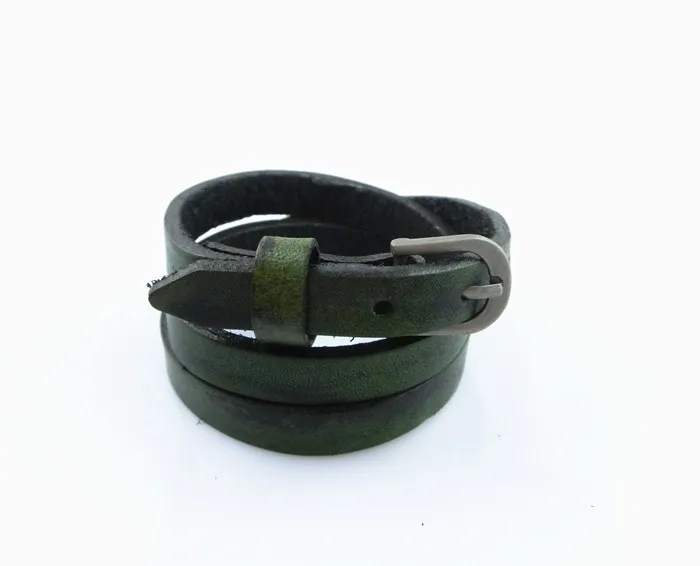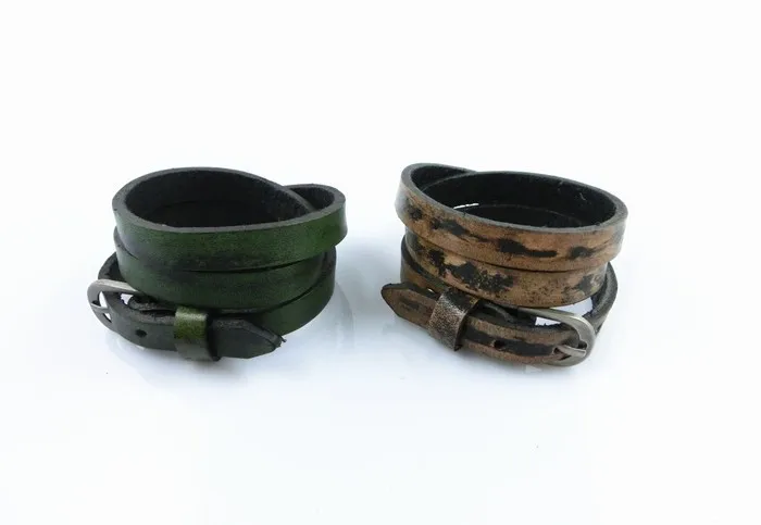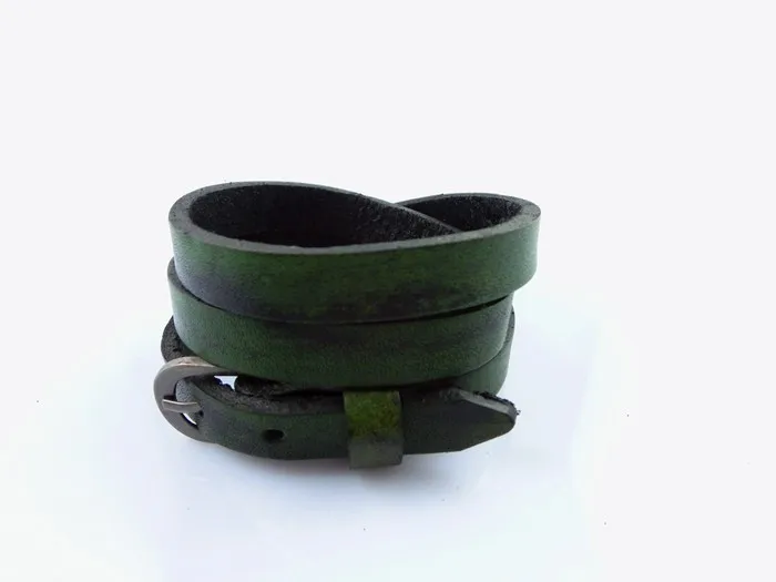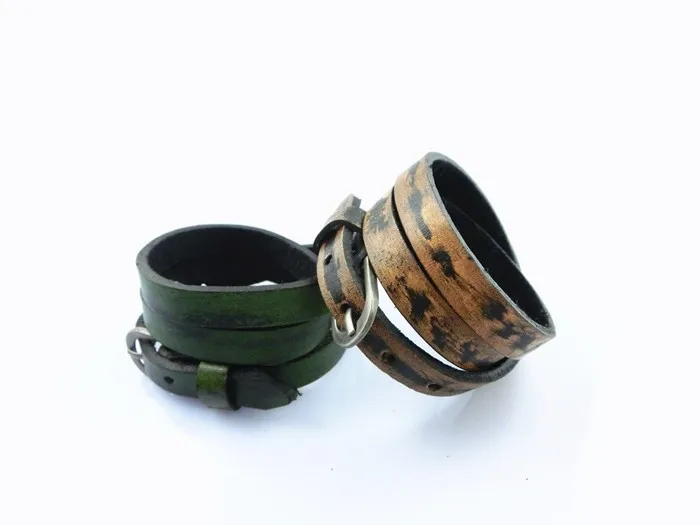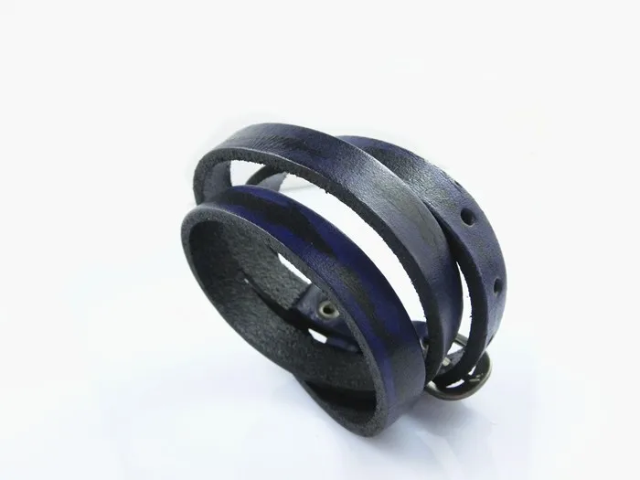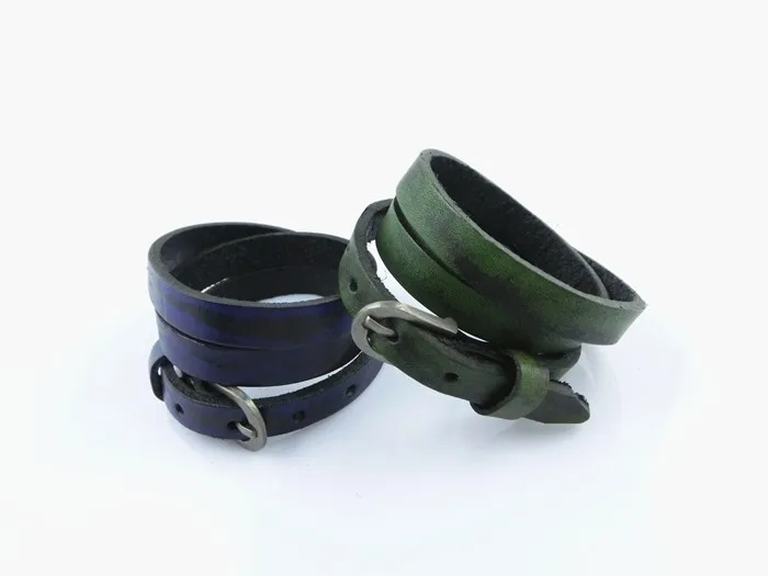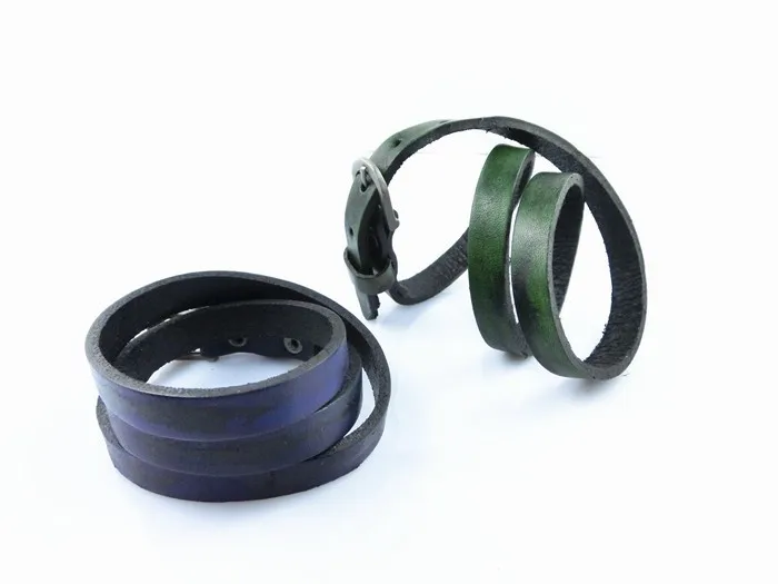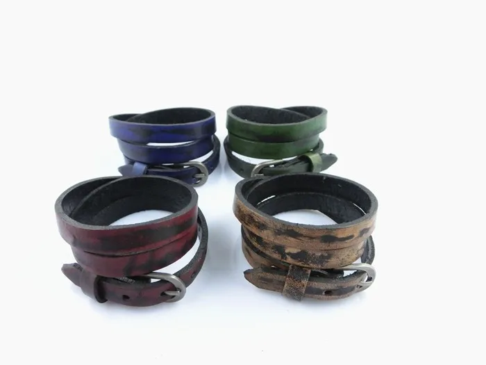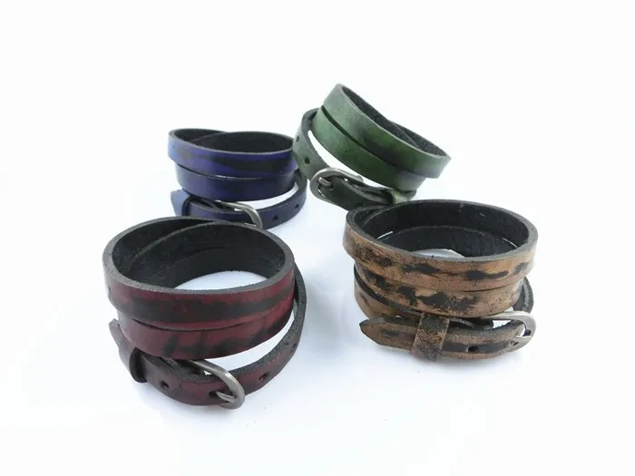 Características: Pulseras unisex fabricadas con cuero y aleaciones metálicas. De varias tonalidades, cuero rojizo, café claro, verdoso, azulado. Con hebilla ajustable para que pueda ser usada por muñecas gruesas masculinas y muñecas finas de mujer. Posee tres capas enrolladas. El tapizado del cuero está entremezclado con negro y las diferentes tonalidades de colores descritas anteriormente.