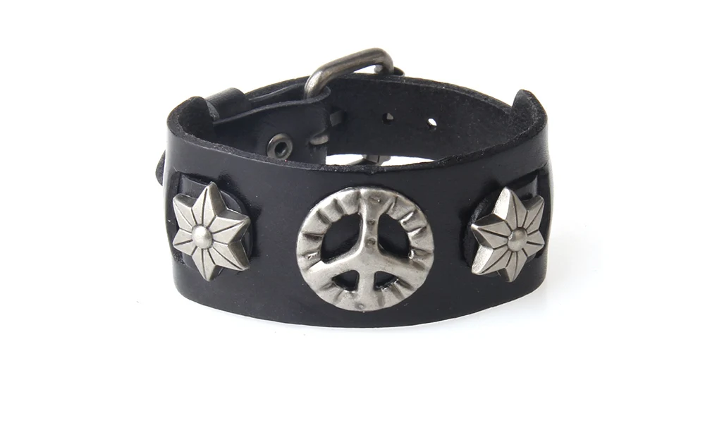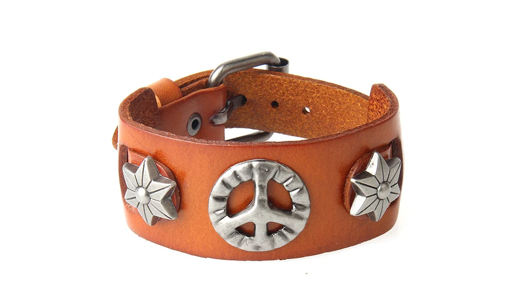 Esta pulsera viene en cuatro colores base: negro, café oscuro, café claro naranja, y rojo pálido. Un accesorio artesanal con enchapes metálicos color plata alrededor del brazalete. Como adorno base, trae incrustado el emblema hippie de amor y paz en aleación metálica amigable con el ambiente que cumple con las normas europeas de protección al ambiente y anti alérgicas (Sin aleaciones de metales y elementos nocivos como el niquel, plomo, cadmio).