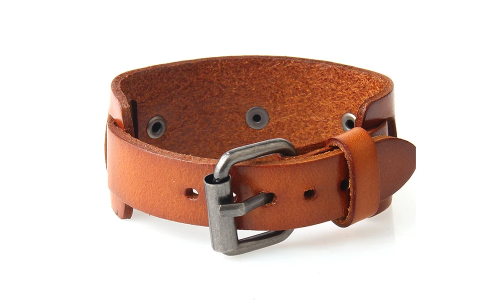 Pulsera de cuero genuino para la comunidad Hippie, para hombre y mujer, de estilo hard rock bohemio, con accesorios metálicos en tono plata. Viene en varios tonos. Un accesorio ideal para regalar en cumpleaños.