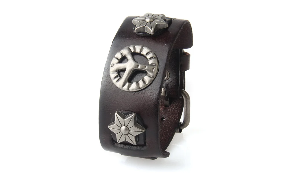 Pulsera de cuero genuino para la comunidad Hippie, para hombre y mujer, de estilo hard rock bohemio, con accesorios metálicos en tono plata. Viene en varios tonos. Un accesorio ideal para regalar en cumpleaños.