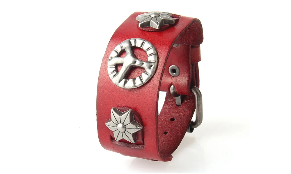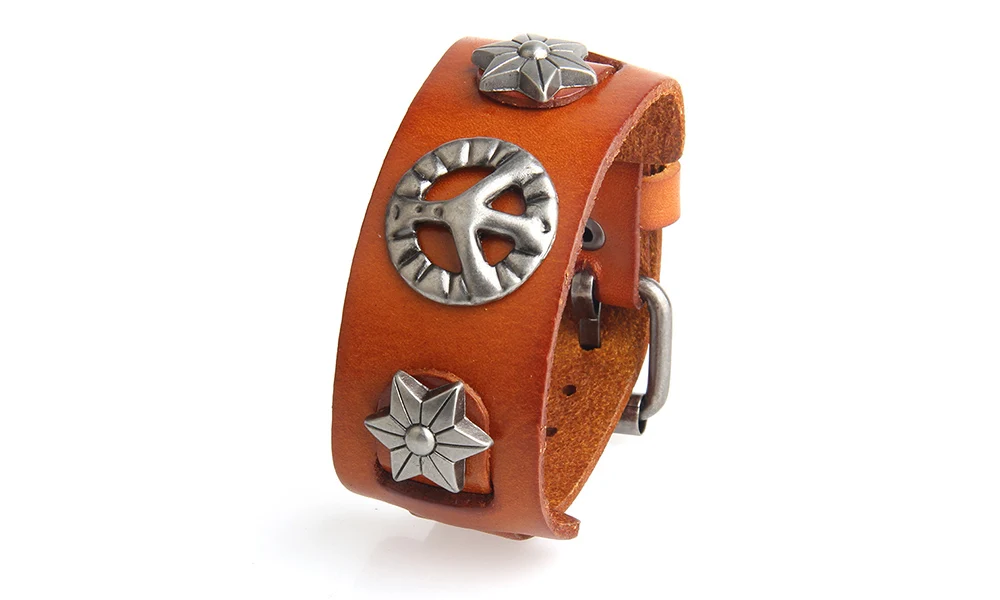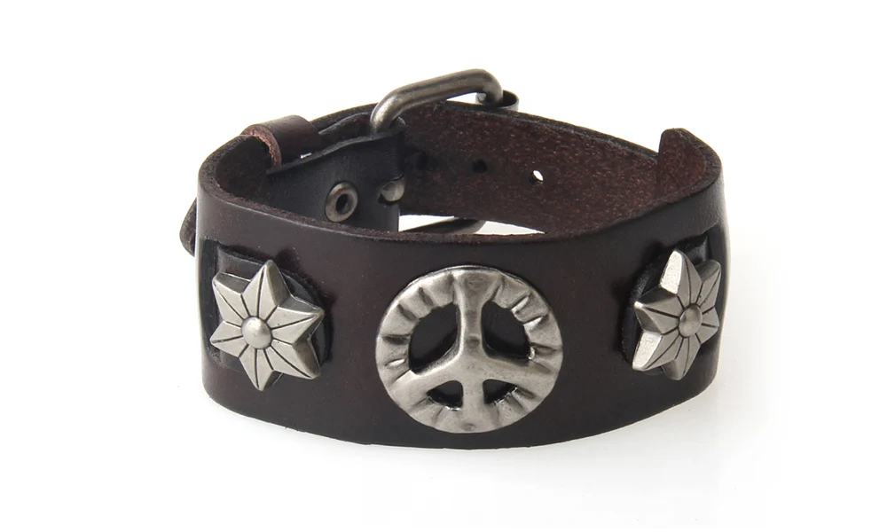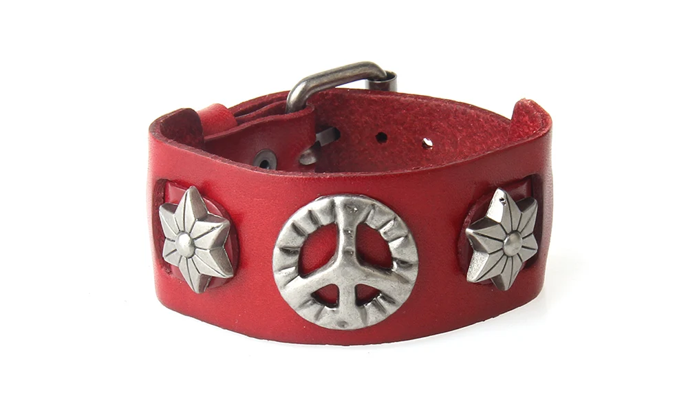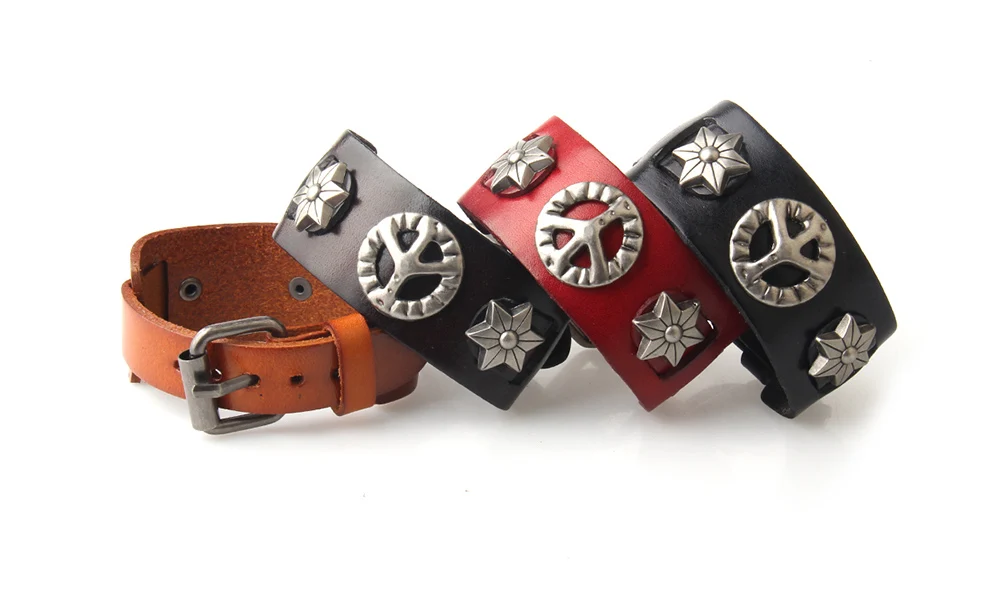Esta pulsera viene en cuatro colores base: negro, café oscuro, café claro naranja, y rojo pálido. Un accesorio artesanal con enchapes metálicos color plata alrededor del brazalete. Como adorno base, trae incrustado el emblema hippie de amor y paz en aleación metálica amigable con el ambiente que cumple con las normas europeas de protección al ambiente y anti alérgicas (Sin aleaciones de metales y elementos nocivos como el niquel, plomo, cadmio).