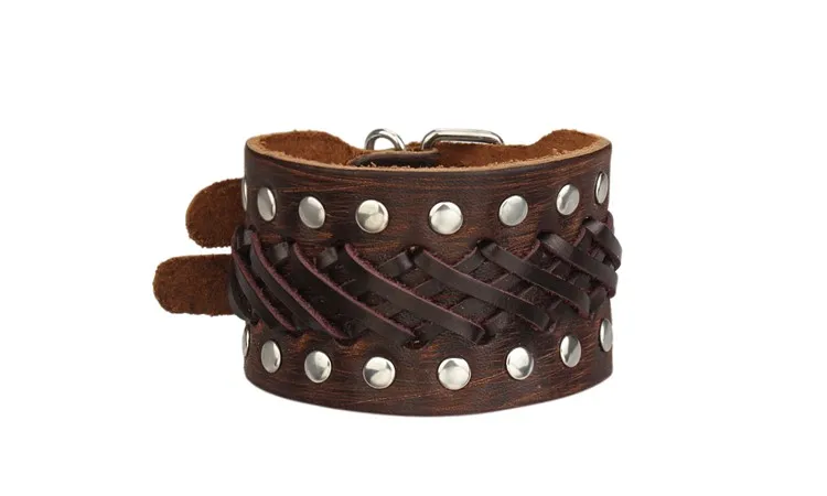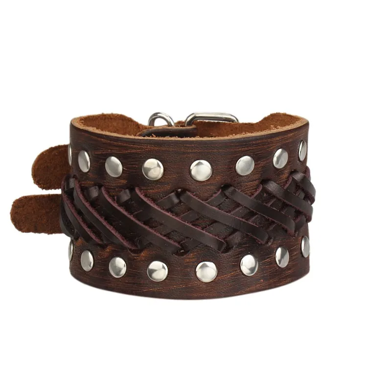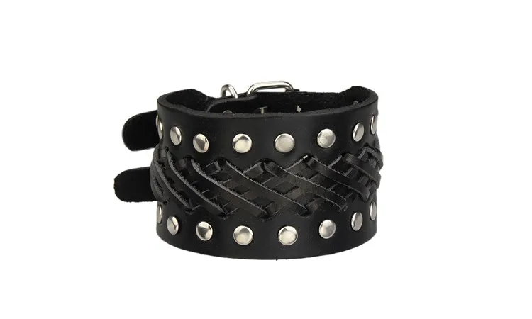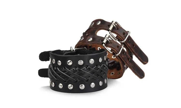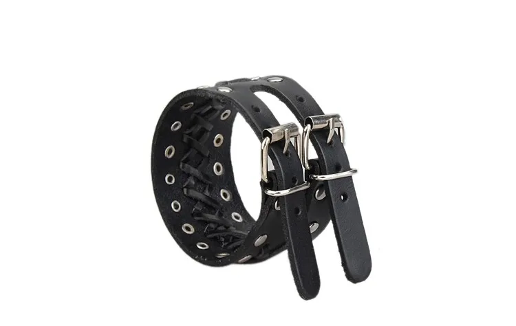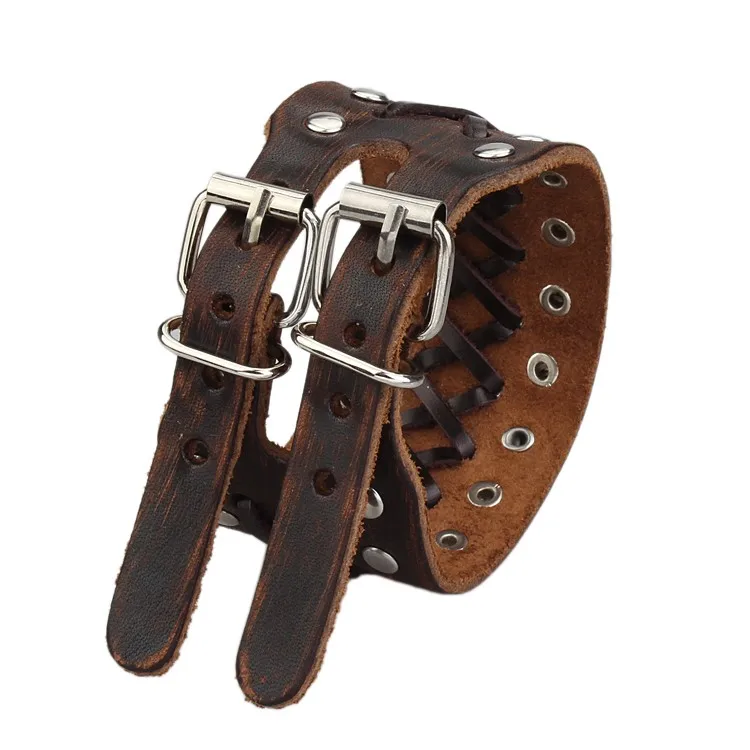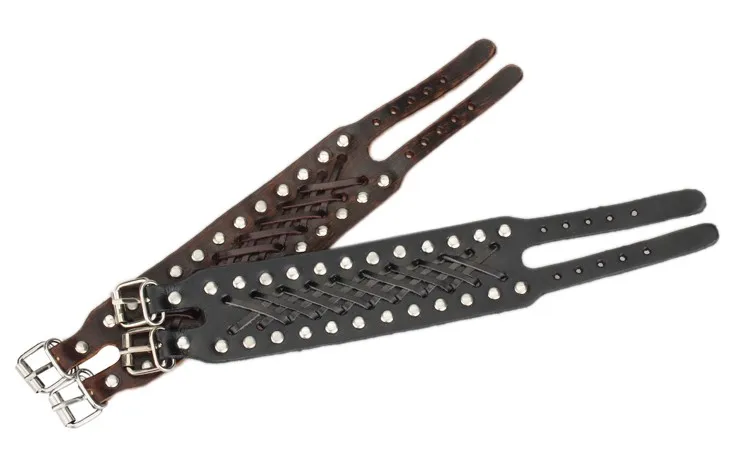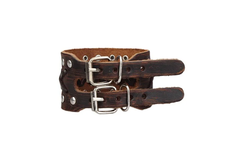 - Pulsera gruesa, con remaches y hebillas metálicas dobles.