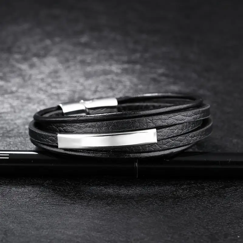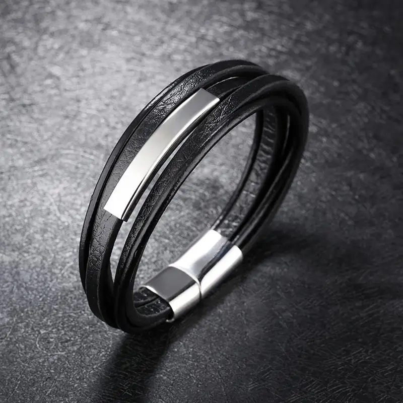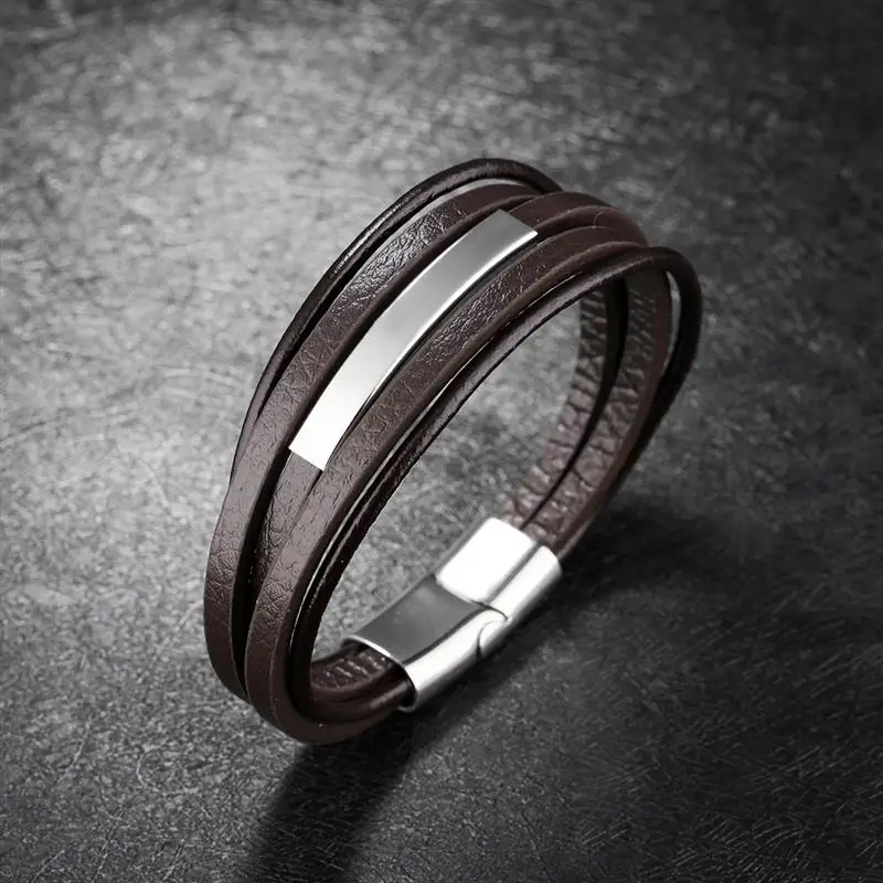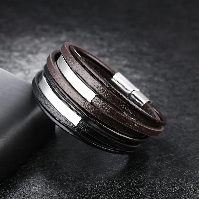 Características de pulsera sofisticada de cuero para hombre: Pulsera multicapa de cuero, con accesorios complementarios de acero inoxidable. De cuero liso y broche metálico. Con 210 milímetros de longitud y un peso 24 gramos, el broche metálico tiene una longitud de 41 milímetros. El cuero viene en dos tonalidades: negro y color café oscuro. La superficie del cuero es rugosa, con aspecto de piedra, de la cual hay dos capas. Hay dos capas finas de cuero liso y redondo, delgado.