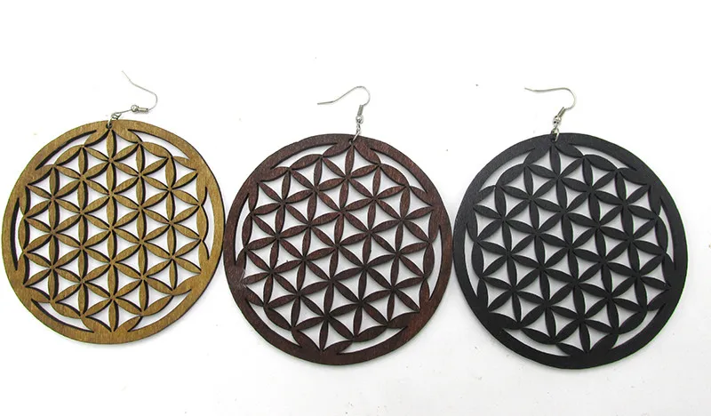 Características de los aretes: Esto aretes africanos son elaborados con madera fina de gran calidad proveniente de este continente, de forma circular y con tallado especial del símbolo de la geometría sagrada. Los aretes vienen en tres tonos básicos: café, negro, y dorado. La longitud del diámetro es de 3 pulgadas.