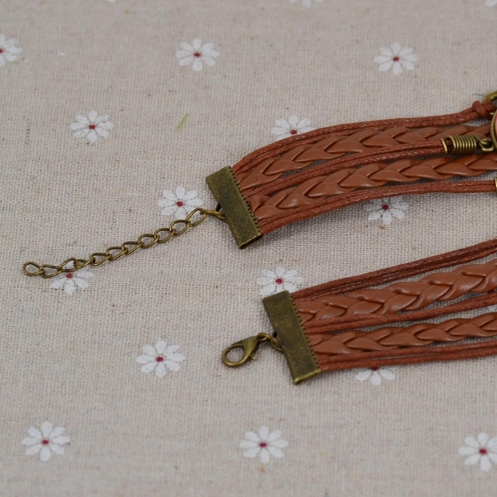 - El color del brazalete es café rojizo. EL brazalete tiene varias capas de cuero trenzado, cuerdas delgadas de cera, y accesorios metálicos de cobre.