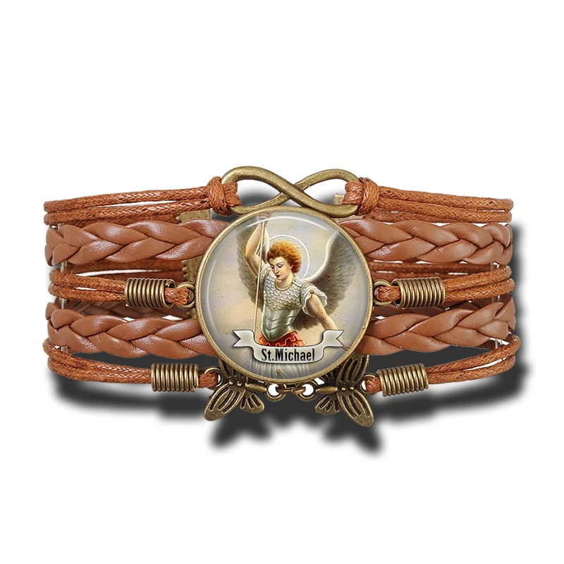 Brazaletes católicos cristianos estilo bohemio vintage artesanal con motivos religiosos, elaborado en cuero y aleaciones metálicas de cobre. Con escudos dedicados a varios santos religiosos, ideal para los feligreses de varios de las iglesias cristianas y católicas.