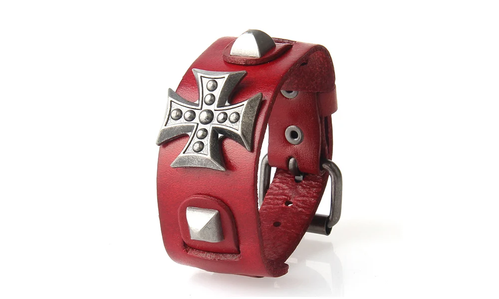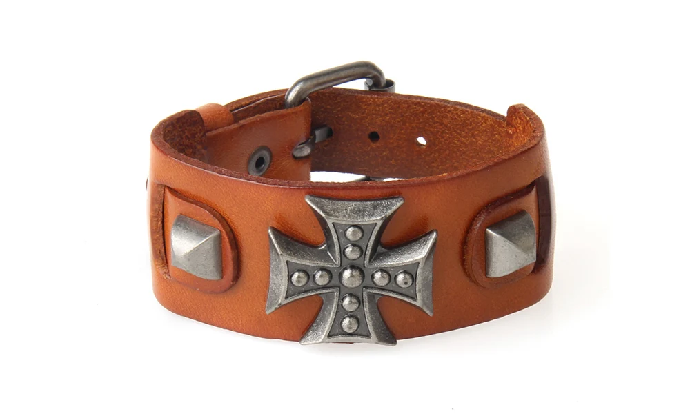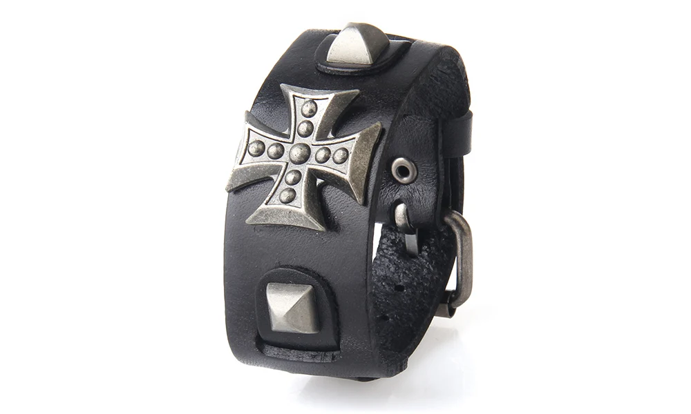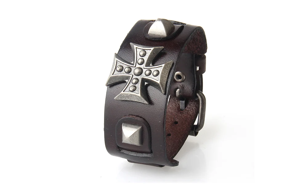 Pulsera bohemia de cuero preferida también por los fans hippies, con cruz cristiana y hebilla metálica, y adornos metálicos alrededor del brazalete de cuero.