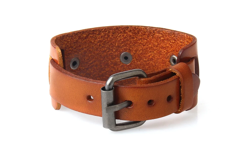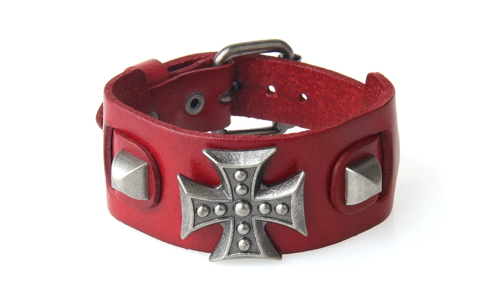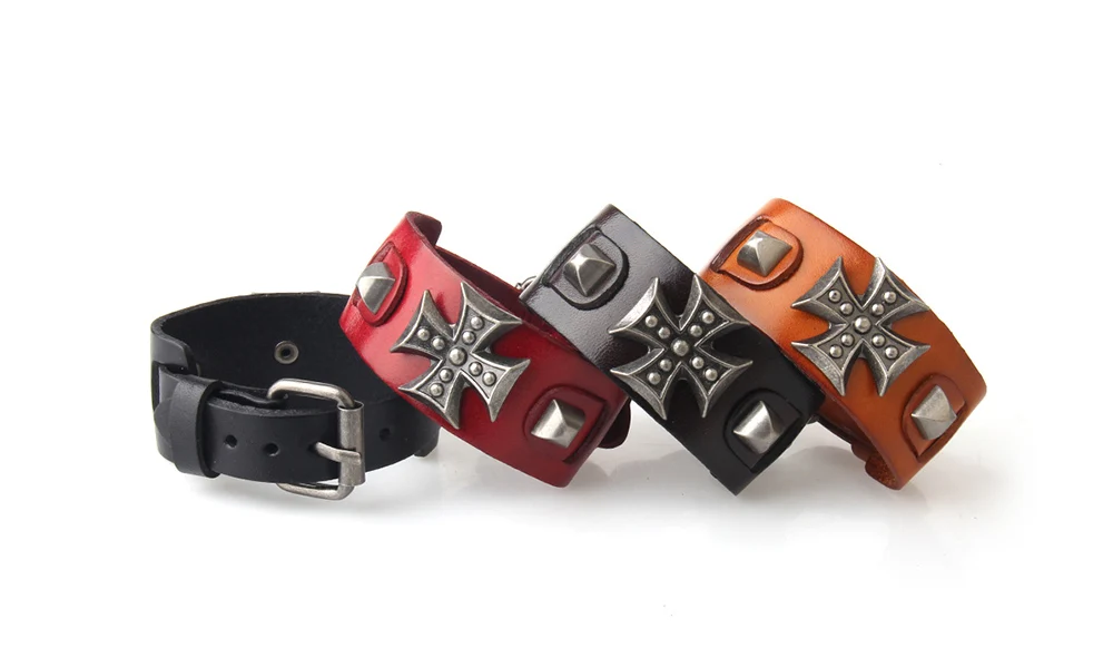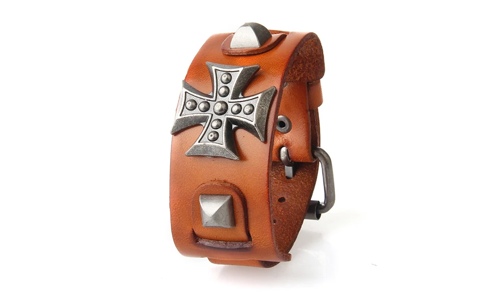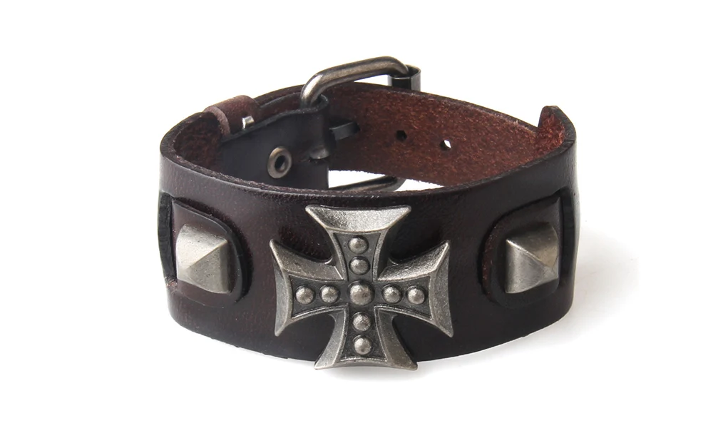 Pulsera bohemia de cuero preferida también por los fans hippies, con cruz cristiana y hebilla metálica, y adornos metálicos alrededor del brazalete de cuero.