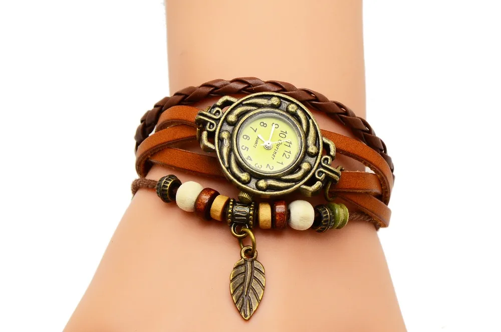 Brazalete de cuero con reloj para mujer. Estilo Boho hippie chic