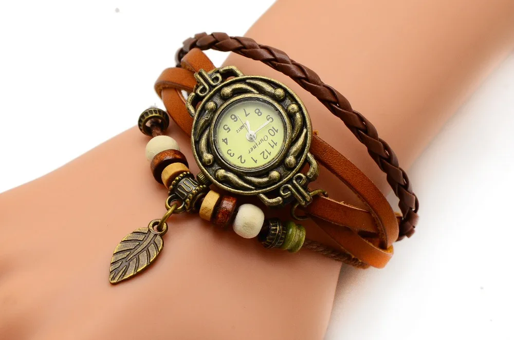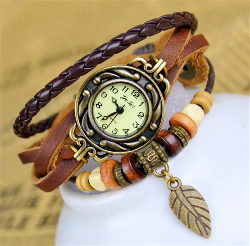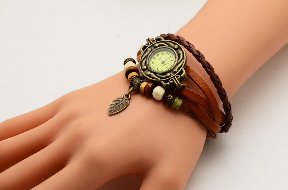 Brazalete de cuero con reloj para mujer. Estilo Boho hippie chic