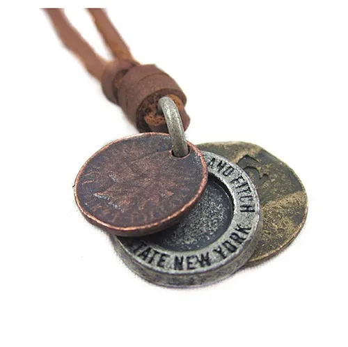 Características: Collar con cadena de cuero, de diseño artesanal, que tiene como adorno base tres monedas antiguas de aleación de zinc de diferente tonalidad con aspecto antiguo. El metal cumple con las normas internacionales de protección ambiental, libre de níquel, cadmio, y plomo. Tamaño del dije 3 x 2 centímetros. La cadena mide 90 centímetros y es ajustable.