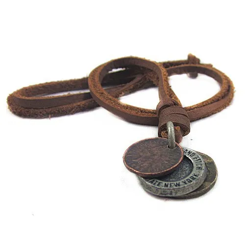 Características: Collar con cadena de cuero, de diseño artesanal, que tiene como adorno base tres monedas antiguas de aleación de zinc de diferente tonalidad con aspecto antiguo. El metal cumple con las normas internacionales de protección ambiental, libre de níquel, cadmio, y plomo. Tamaño del dije 3 x 2 centímetros. La cadena mide 90 centímetros y es ajustable.