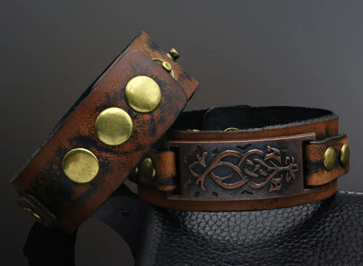 Características de la pulsera hipster de cuero para hombres: Elaboradas con cuero, de dos tonos básicos, negro y café con leche o kaki. Posee remaches para sujetar y como medio de ajuste para diferentes tamaños de muñeca. Posee una placa metálica tallada como adorno base en la parte frontal de la pulsera, tratada para crear un aspecto vintage retro.